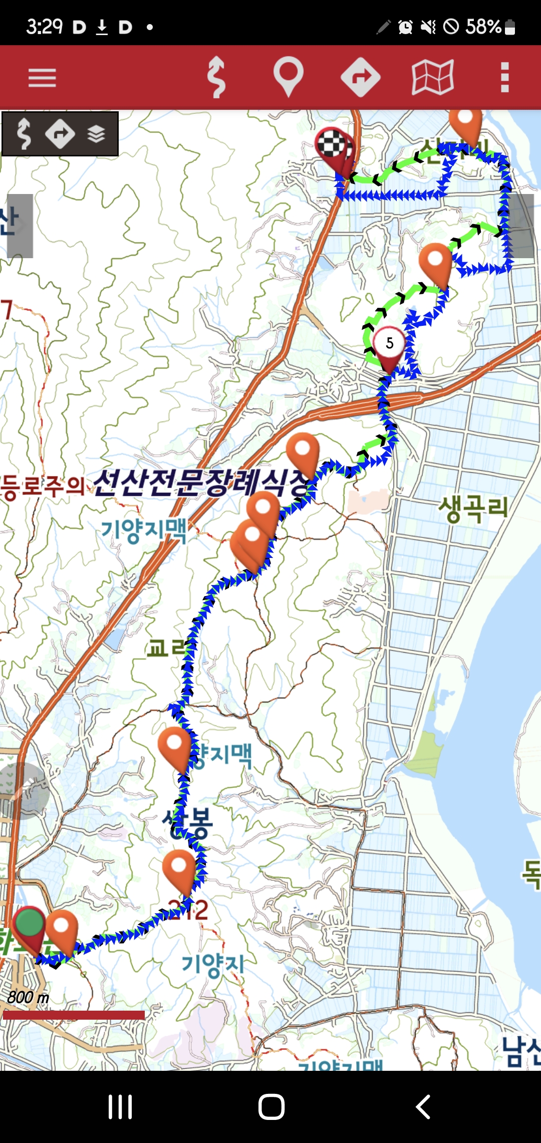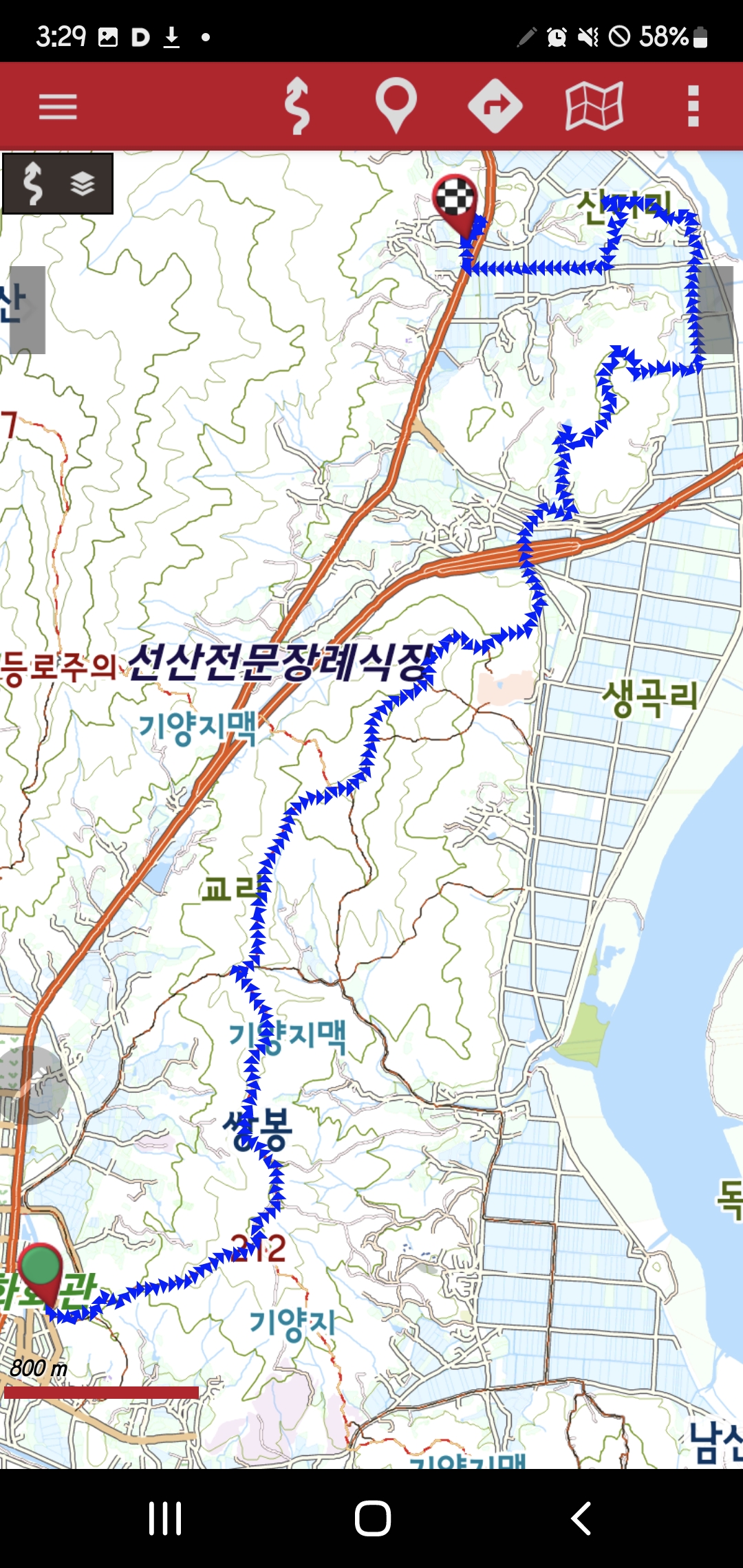 -신기2길-사거리-서쪽방향 길따라진행-선상동로길 합류-신기마을회관(여기서 하투산 왕복)-북동방향 길따라-선상동로255번지