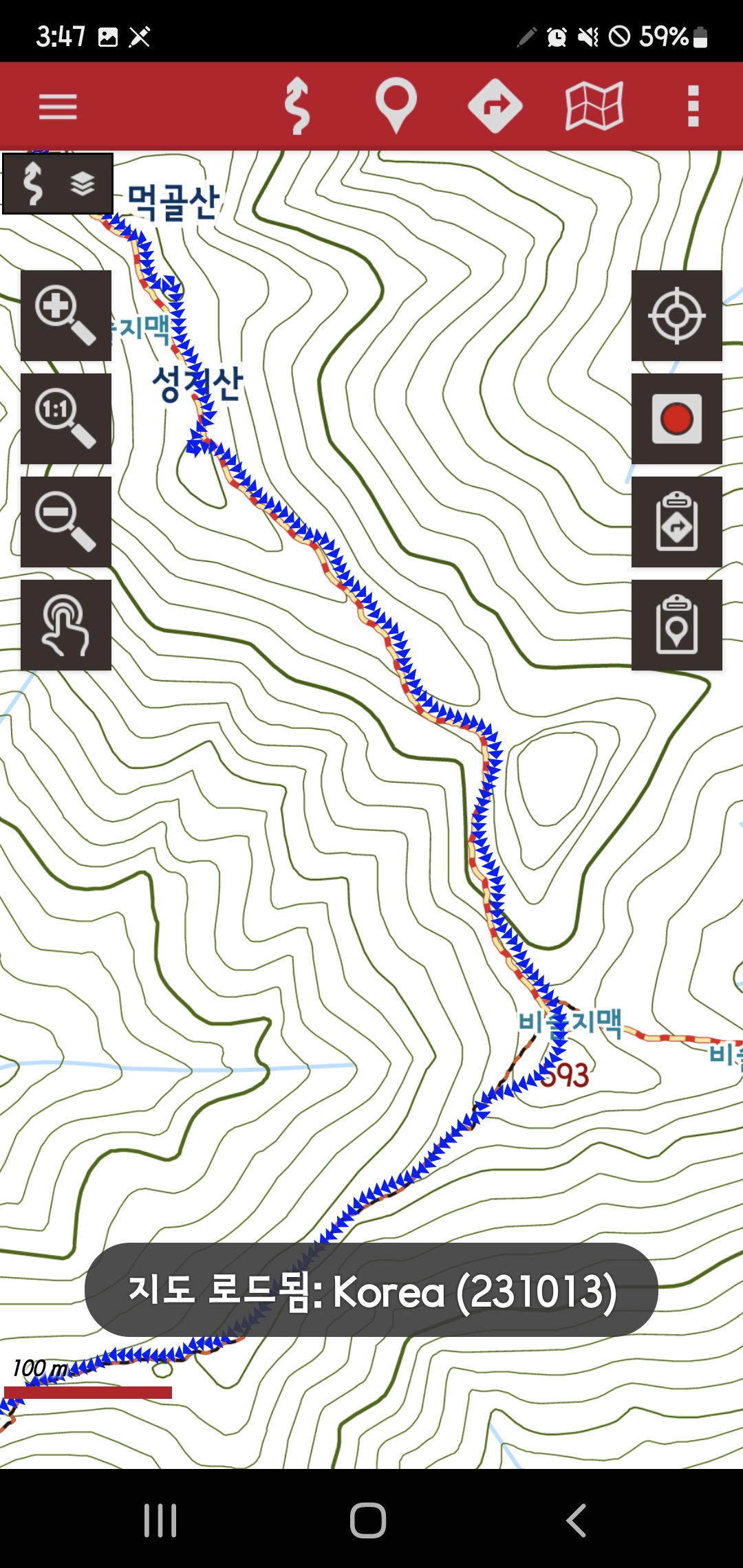 -비슬지맥길 합류-남동릉진행-먹골산 652m-남릉진행-성지산 652m-남동릉진행-593봉,비슬지맥길 삼거리