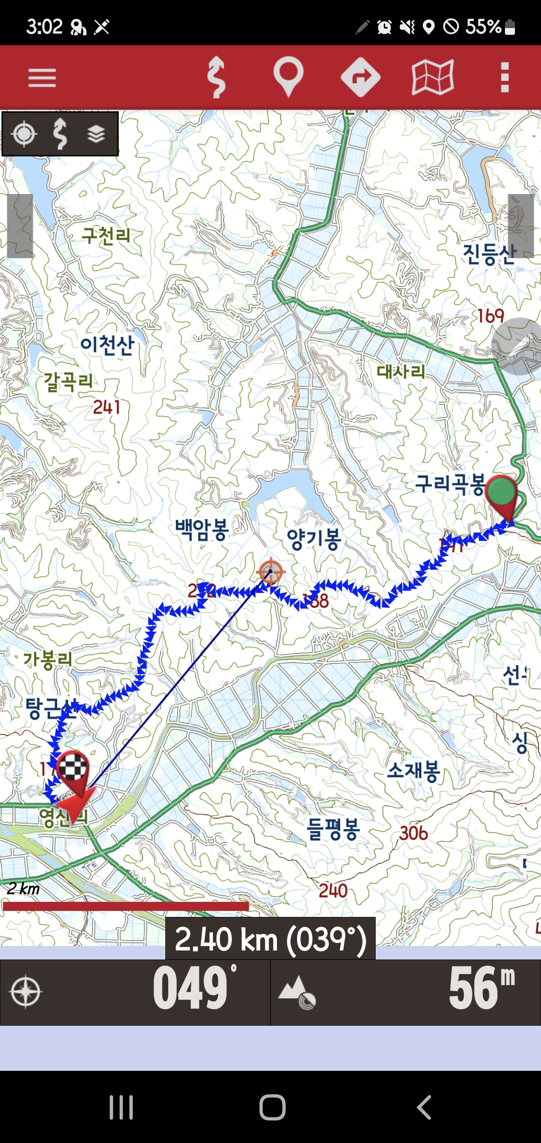 개천면 1039번도로 수리고개 -임도길 진입-북서릉진행-구리곡봉 190.7m,삼각점-남서릉진행-임도길 합류