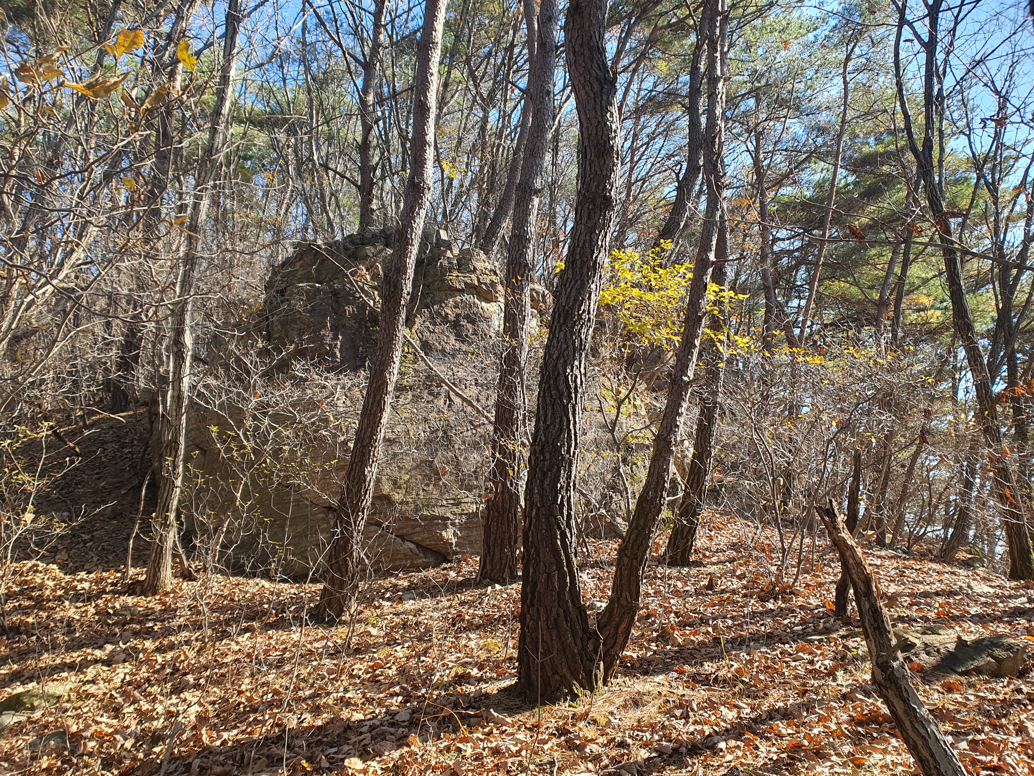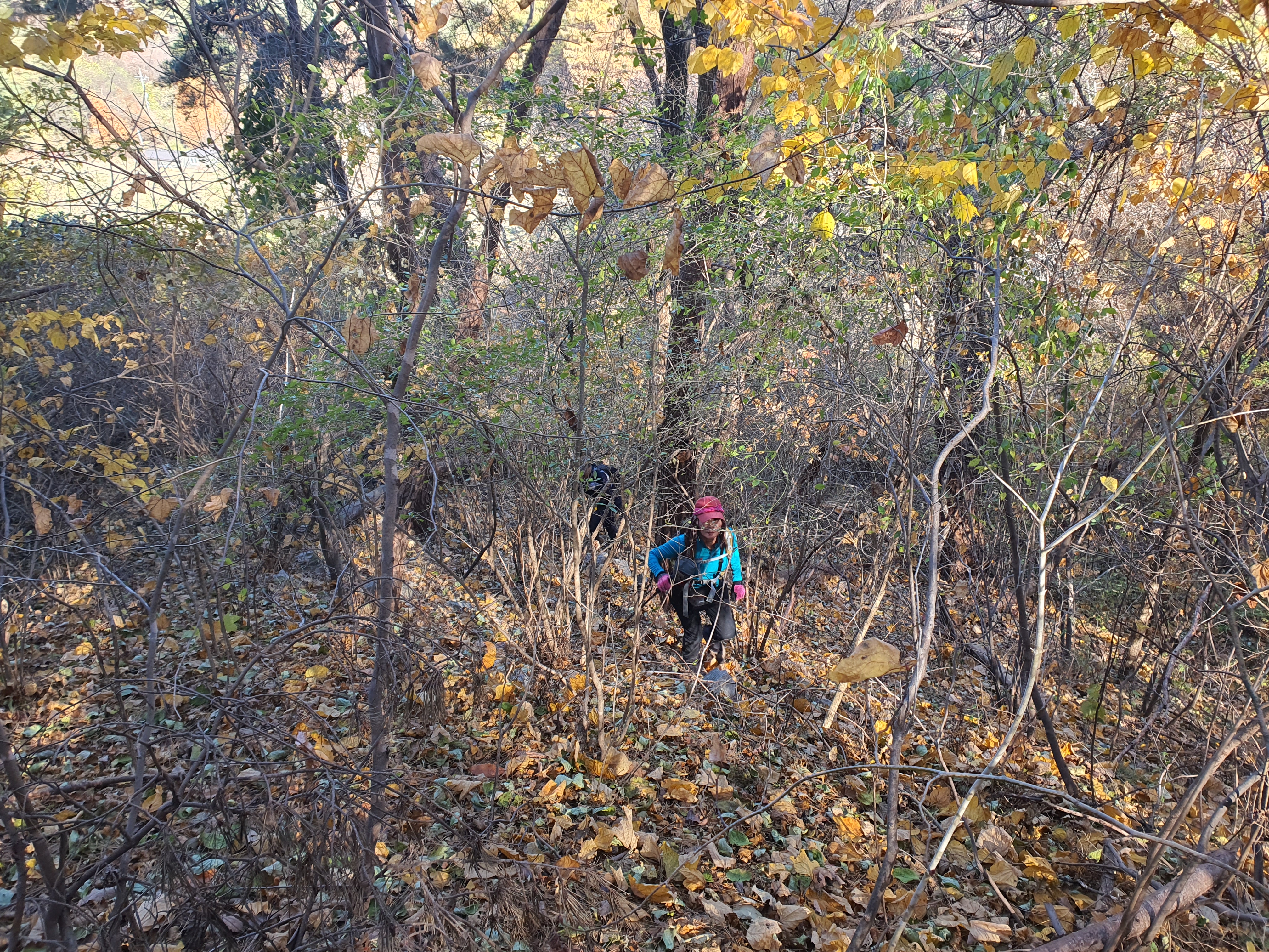 돌산 그위로 낙엽이 쌓인 아주 가파른 내리막길이 이어집니다