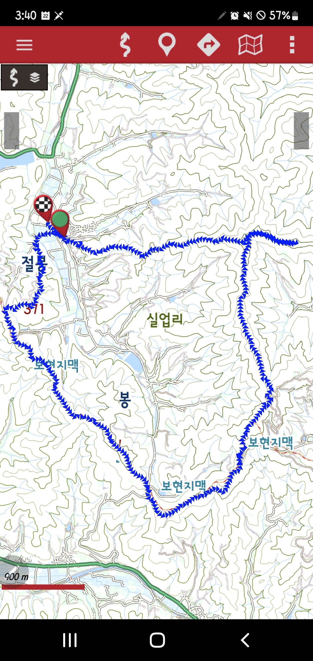실업1리 버스정류장-정자-미천 건너-남릉진입-절봉 371m,삼각점-서릉진행-보현지맥길 합류