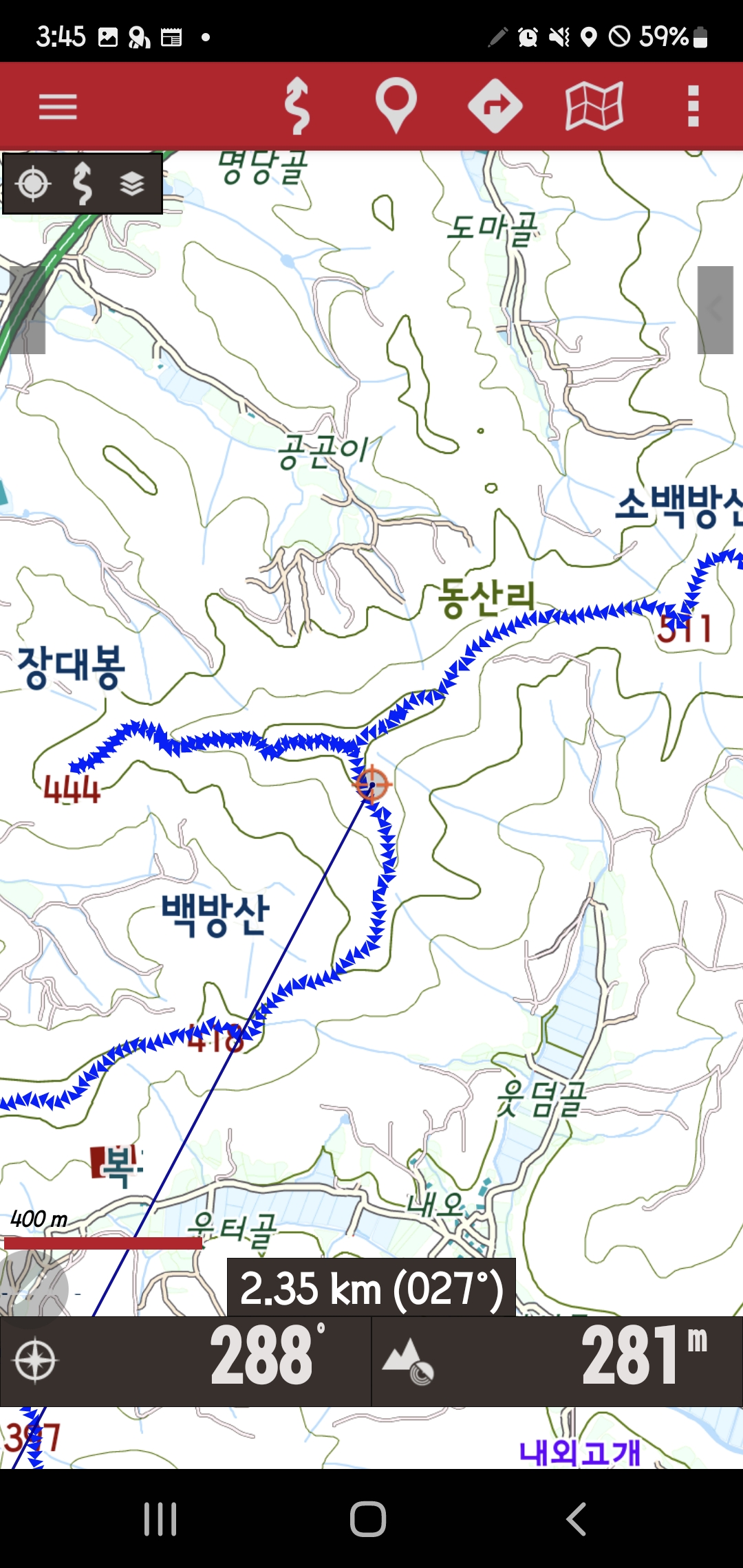 -옥녀봉으로 돌아가서-남릉진행 -암릉,우회해서-백방산 418m-서릉진행-434봉-남서릉진행-능선삼거리(삼대산왕복)