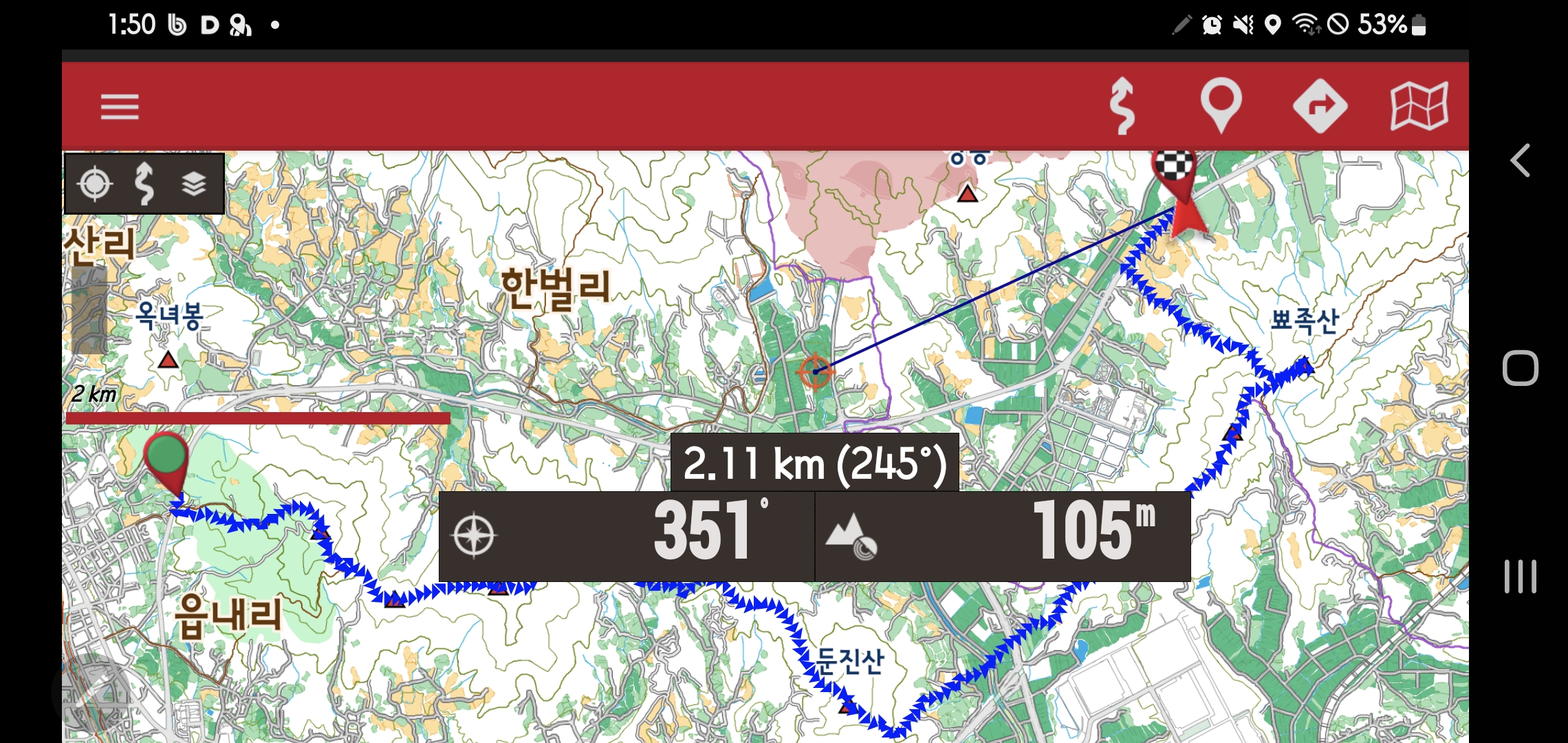 -동릉진행-안부-비산3리 갈림 이정표(여기서 뾰족산 왕복합니다)-북동릉진입-뾰족산 328m-삼거리로 돌아가서