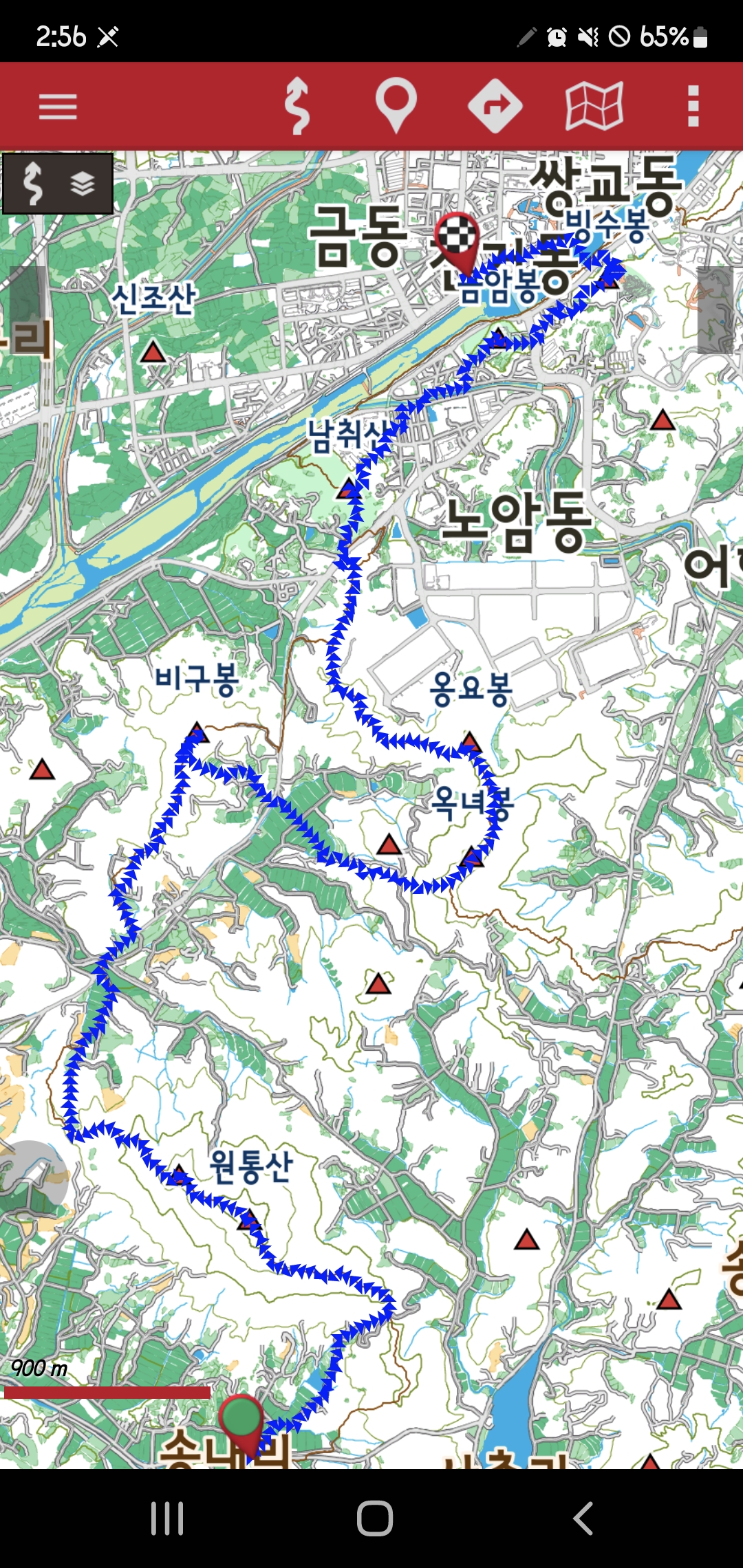 -대석골방향 진행-길끝에서 동동남릉 진입-임도길 건너-동릉진입-옥녀봉 272m-북동릉진행-옹요봉 207m-서서남릉진행